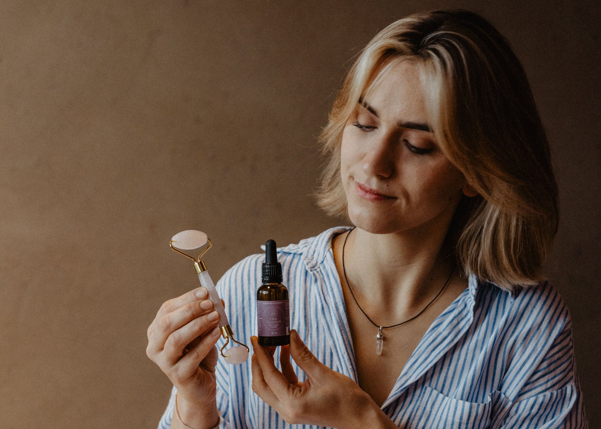Das Ayurveda Glow Set vereint das kostbare Glow Gesichtsöl mit dem sanft kühlenden Rosenquarz Roller – ein harmonisches Duo für Deine tägliche Selfcare-Routine.