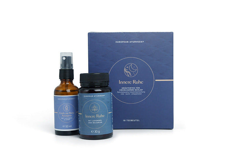 Unser Innere Ruhe Ritual vereint die kraftvollen European Ayurveda® Innere Ruhe Kapseln, den wohltuenden European Ayurveda® Innere Ruhe Tee und das harmonisierende European Ayurveda® Auraspray Finde zur Ruhe – ein fein abgestimmtes Trio für Deine tägliche Auszeit.